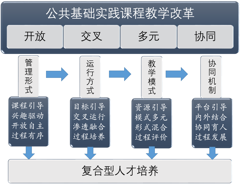 目前,物理实验中心分布于将军路校区和天目湖校区,实验室建筑面积近8000平方米,资产总额约3000余万元。各实验室面向全校各专业学生教授物理实验课程20多门,开设实验项目数量100多项,年开放人次数近6万。中心现有教师17人,其中高级职称5人,中级职称12人。在互联网+、新工科建设引领的新一轮科技革命和产业变革背景下,物理实验中心践行以“开放管理、交叉培养、多元融合、协同育人”为导向的教学理念和育人模式(图2),注重教学管理与信息技术的深度融合,育人模式与形势发展的高度结合,为我校复合型人才培养打下了坚实的基础。