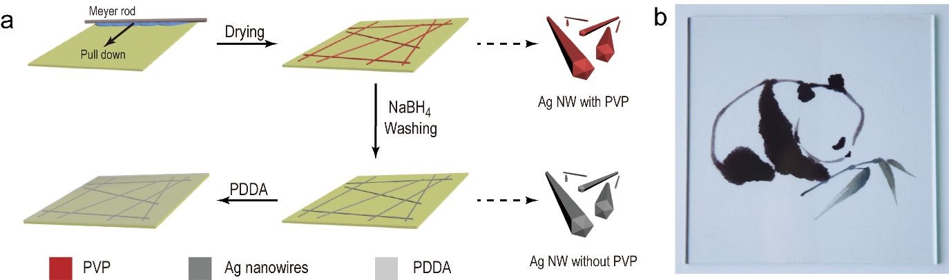 近日,手机娱乐城官方网站 应用物理系在该研究方向取得新进展。在实验上展示出大尺寸透明银纳米线导电薄膜,其可见光透过率超过90%,屏蔽效能可达到31.3 dB,为推进实用化奠定了基础。