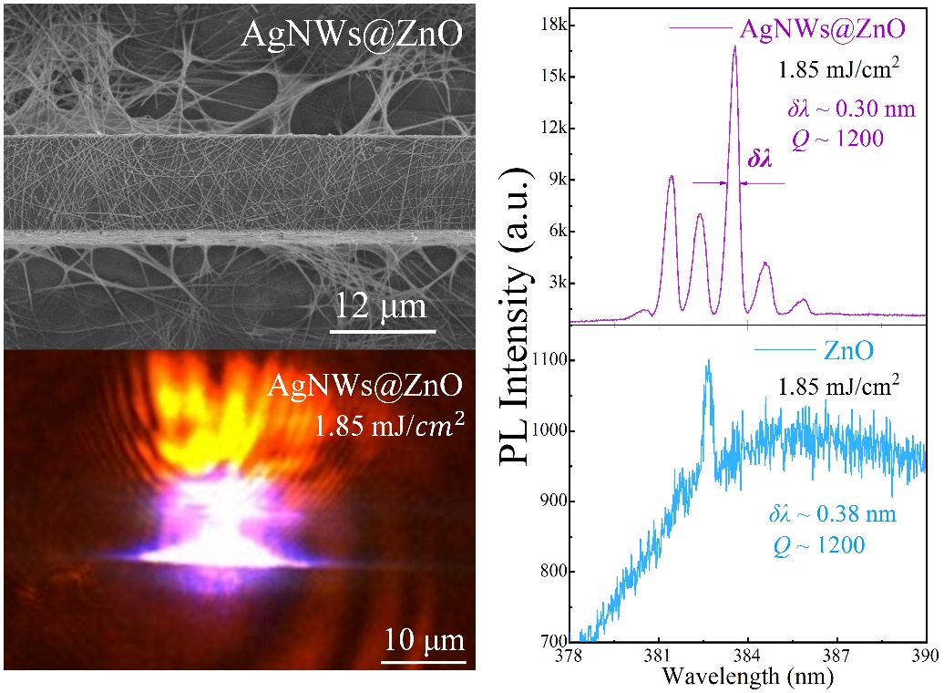 紫外低维激光器件,由于其在短波区内具有极高的光子简并度和极强的光子限域效应而被广泛研究并应用于工业、农业、国防、医疗等领域。在该领域,学界目前的主流研究方向是如何构筑高性能的WGM(Whispering-Gallery-Mode)模式激光器件。但是,WGM模式激光器的输出方向具有明显的方向性差,输出模式较多,单色性差等缺点。相较于WGM,FP(Fabry-Perot)模式激光器则具有良好的方向性。ZnO作为典型的第三代宽禁带化合物半导体材料,具有3.37eV的禁带宽度和60 meV的高激子结合能,是研究紫外波段光与物质耦合作用的理想材料,结合拥有紫外表面等离激元效应的AgNWs能够用于构筑增强型的紫外低维激光器。近期,应用物理系本科生党红亮同学在该研究方向取得新成果,并以第一作者在JCR二区期刊发表学术论文。