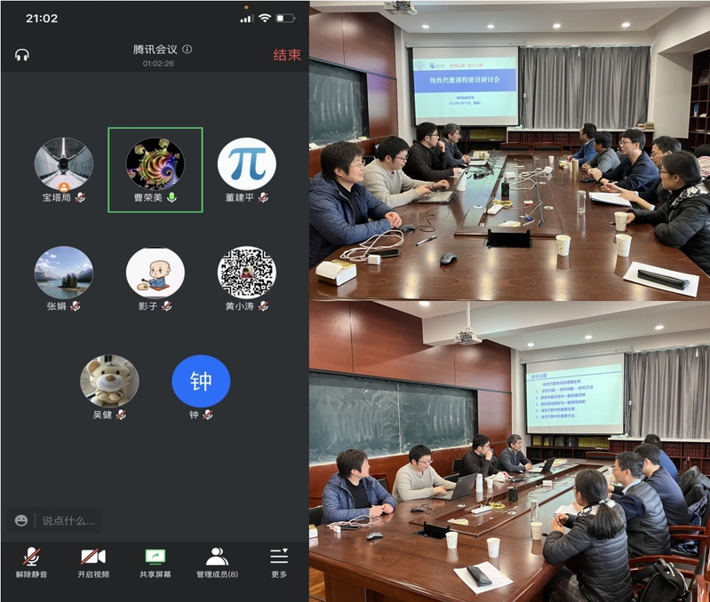 寒假伊始,理学院线性代数教学团队就在1月15日和17日两天分别召开了线上和线下会议,总结课程组2021年的工作,研讨落实2022年的课程建设工作,并针对具体问题进行研讨。课程负责人宋大伟老师主持了17日线下研讨会,曹荣美、袁泉、肖光世、张娟、钟玲平、黄小涛、董建平、吴健等老师参加了研讨会。理学院副院长李晋斌也参加了本次会议。