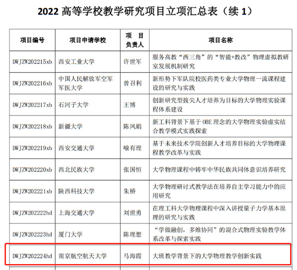 为了推动“大学物理”和“大学物理实验”课程的教学改革,提高教学质量,教育部高等学校大学物理课程教学指导委员会(以下简称教指委)在2022年7月开展了全国高等学校教学研究立项项目申报和评审工作。经单位申报、教指委地区工作委员会初评、专家网络评审、教指委教学研究工作委员会审核和教指委主任联席会议审定,最终确定40项申报项目为2022年高等学校教学研究立项项目,手机娱乐城官方网站 马海霞副教授的《大班教学背景下的大学物理教学创新实践》项目获批。