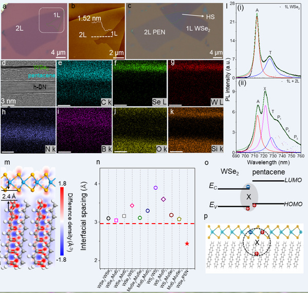 图1 | 单层硒化钨(WSe2)/双层并五苯(pentacene)异质结的表征。
