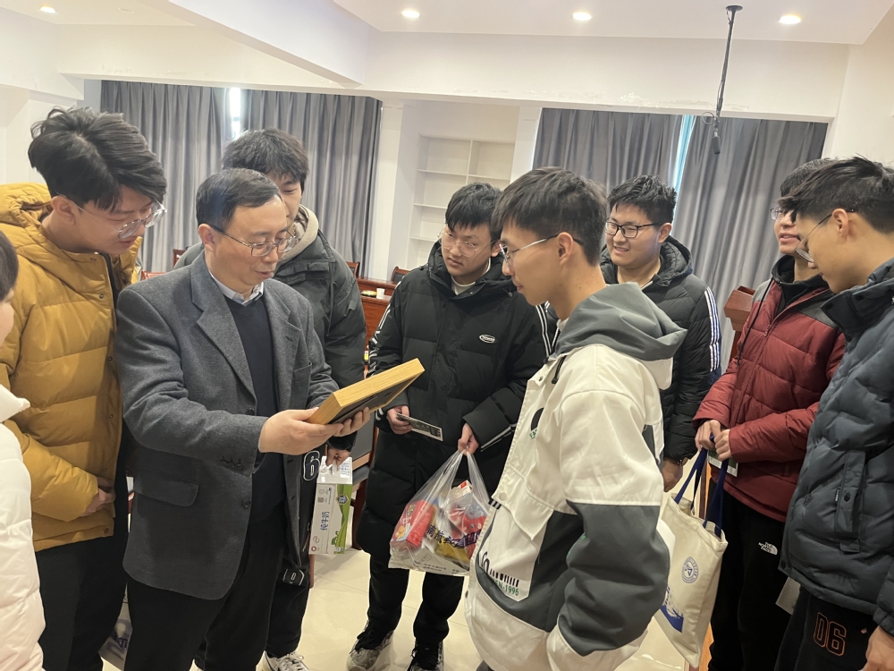 2月14日,校党委常委、副校长姜斌在开学第一周来到理学楼,与联系的手机娱乐城官方网站 两个大一宿舍同学亲切交流,关问同学们新学期学习、生活近况,并为同学们带来了丰富的精神食粮和暖心的关爱礼物。