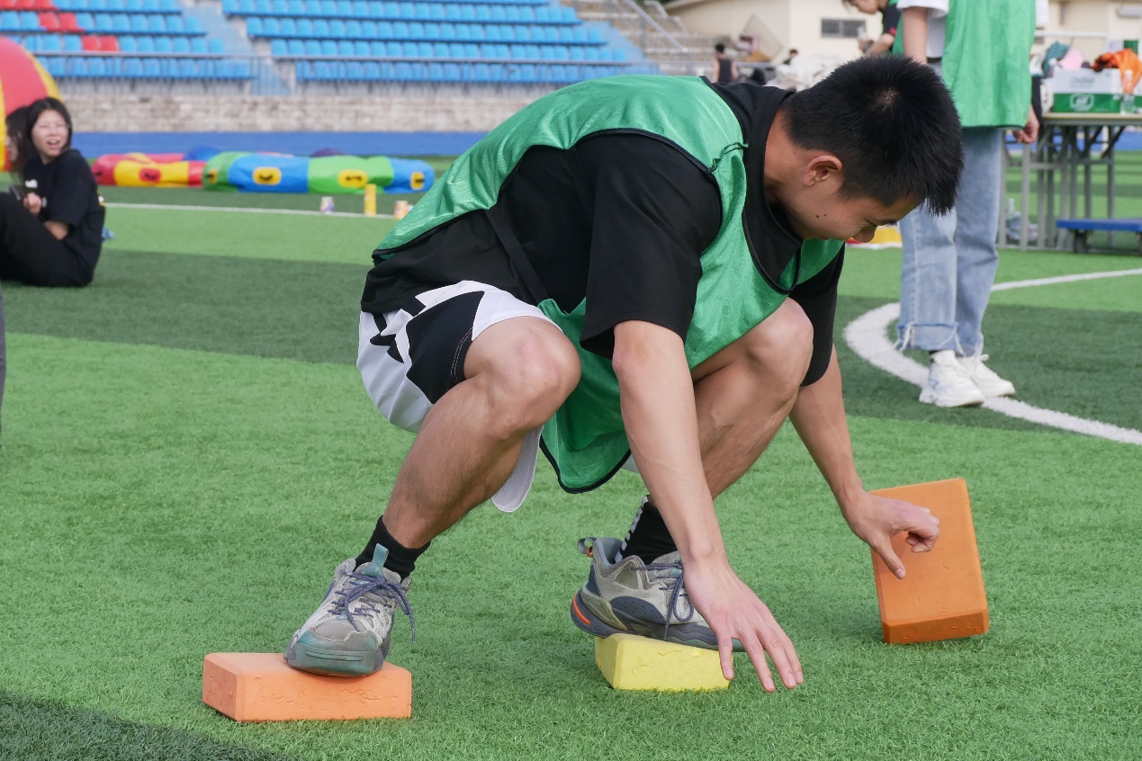 在“前赴后继 摸石过河”项目中,各个代表队参赛队员立于起跑线后的第12块河石上,手拿第3块河石。在听到哨声之时,队员们依次将河石踩在脚下交替向前行进。各参赛队员们竭力都在协调自己身体平衡,以最快的速度奔向终点,和接力的队友击掌。四肢的酸痛早已被合作的喜悦替代,奔向终点的他们是最值得敬佩的人!