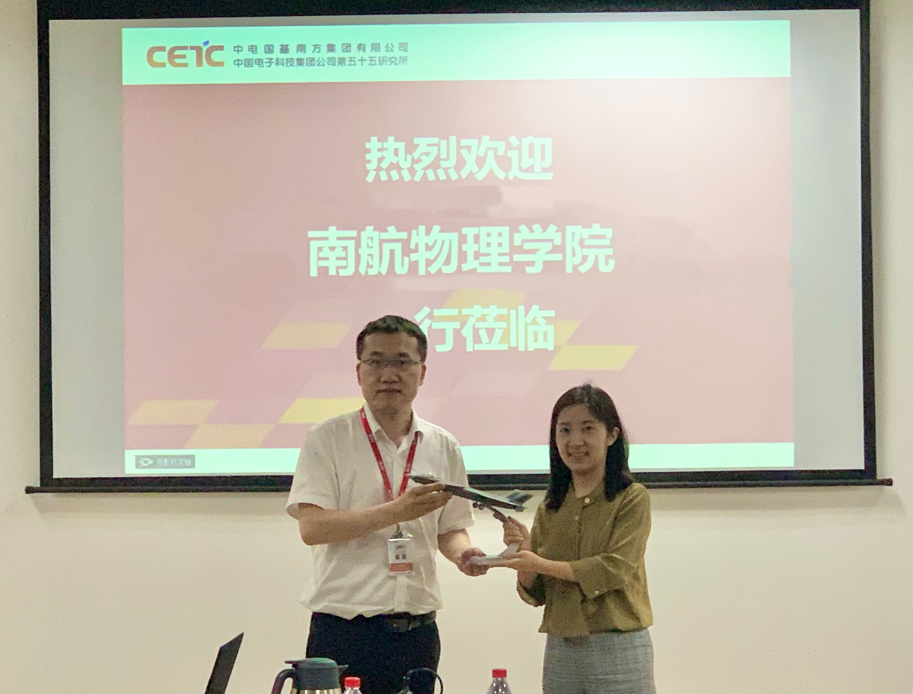 谢俊领代表中国电科五十五所对欧珊一行到访表示热烈欢迎。他简要介绍了中电五十五所的发展历程、娱乐城官网、人才引进、校企合作等方面的基本情况,重点讲解了与物理学科匹配度较高的研发部在技术产品、就业招聘等方面的情况和需求。
