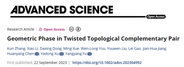 近日,手机娱乐城官方网站 2019级本科生张琨在伏洋洋教授的指导下在《Advanced Science》(中科院SCI一区TOP)发表了题为“Geometric phase in twisted topological complementary pair”的研究成果,这是手机娱乐城官方网站 本科生首次以第一作者在这样的国际顶级期刊发表论文。