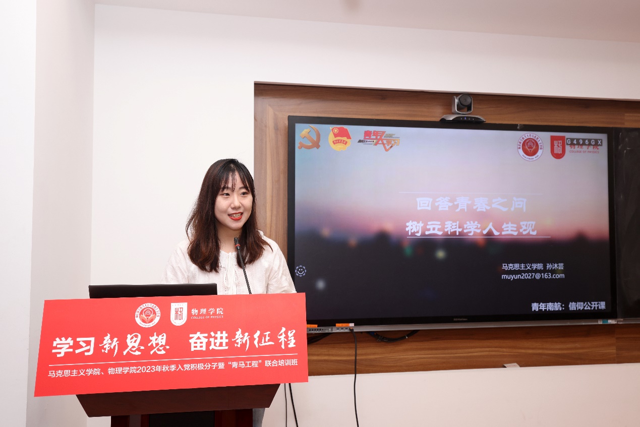 孙沐芸以“回答青春之问,树立科学人生观”为题作开班授课。她指出,“立志做有理想、敢担当、能吃苦、肯奋斗的新时代好青年”,这是习近平总书记对新时代青年的谆谆嘱托。而人生观教育是新时代青年思政教育的核心内容,更是为党和国家将大学生培养成为社会主义合格建设者和可靠接班人的重要内容。新时代,加强大学生人生观教育既是回应大学生个体特殊心理发展阶段的需求,也是满足国家社会发展的现实要求,具有重要的实践意义。