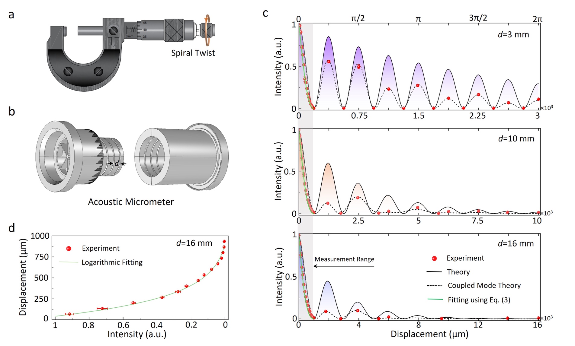 2声学螺旋测微器样机设计及实现。(a日常使用的螺旋测微器;b基于螺纹轨道原子的声学螺旋测微器;c不同螺距声学螺旋测微器(q4)的干涉强度随着旋转位移的变化;d声学螺旋测微器(q4d16 mm)定标函数曲线。