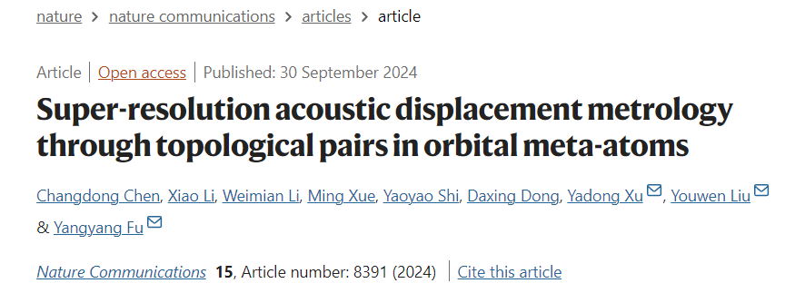 近日,手机娱乐城官方网站 信息光子学团队在超分辨声学位移计量方面取得了突破性进展团队通过构建共轭拓扑对的创新概念,揭示了模式空间马吕斯定律的物理机制,并基于螺旋测微原理提出了一种超高精度的位移计量新范式,并成功利用工作波长为100mm的低频声波实现了1.2μm的位移超分辨λ/105)。相关成果以“Super-resolution acoustic displacement metrology through topological pairs in orbital meta-atoms”为题在线发表在国际顶级期刊《Nature Communications》上。伏洋洋教授、刘友文教授以及苏州大学的徐亚东教授为该工作的共同通讯作者,陈昌东副教授、博士生李潇为共同第一作者,薛明讲师、施瑶瑶副教授、董大兴副教授、已毕业硕士李卫冕对该工作亦做出了重要贡献。