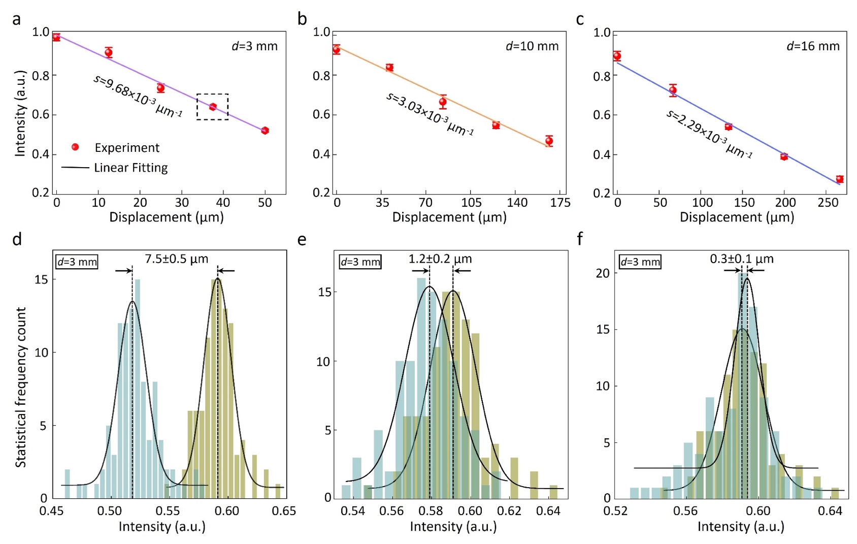 3声学螺旋测微器的分辨率和精度。不同螺距d3 mma),d10 mmb),d16 mmc)声学螺旋测微器的最佳线性区;声学螺旋测微器(d3 mm)的分辨率和精度:完全能分辨(d)、恰好能分辨(e)、不能分辨(f)。