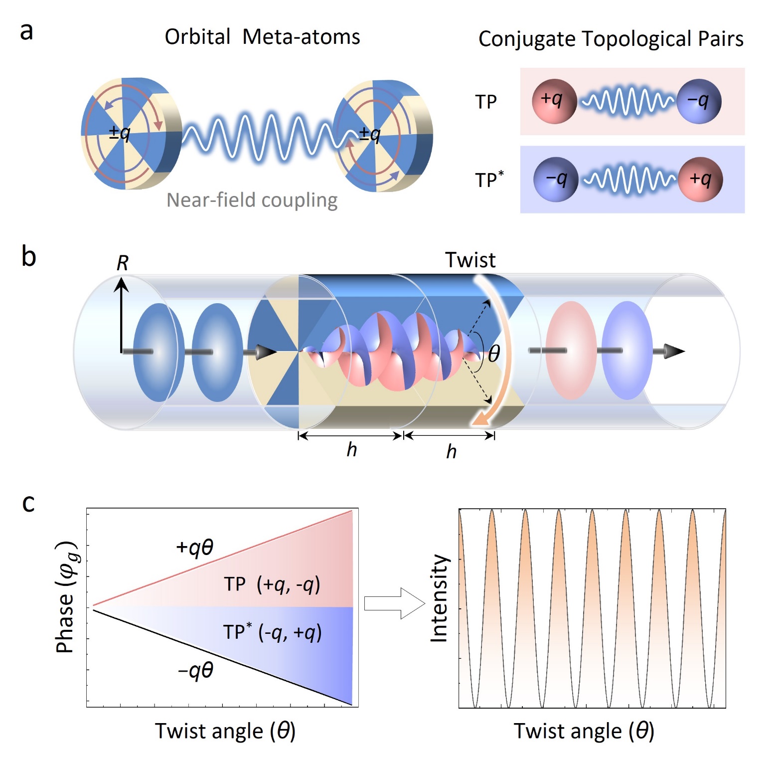 1共轭拓扑对的形成及其产生的声学马吕斯干涉效应。a轨道人工原子及其在模式空间形成共轭TPs示意图;(b)圆柱波导中入射平面波-OAM模式-出射平面波的实空间演化示意图。(c共轭TPs的在模式空间累积相反的几何相位并产生干涉示意图。