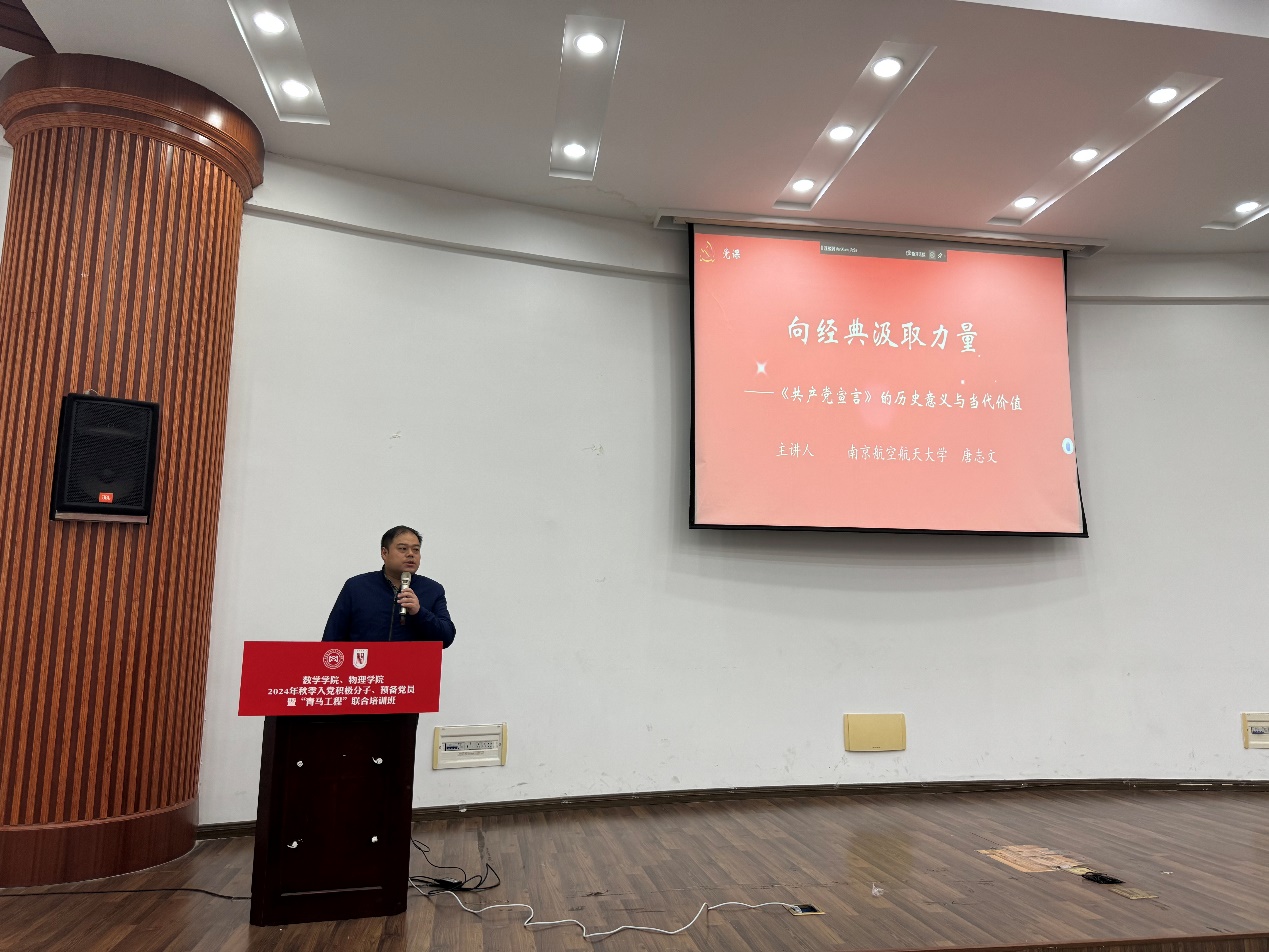 培训第一场专题辅导报告由校学生处学生资助管理中心主任唐志文主讲《<共产党宣言>的历史意义与当代价值》。他从为什么叫共产党、为什么要消灭私有制、共产是什么等问题切入,深入浅出的阐述了《共产党宣言》中崭新科学的世界观和社会历史观的伟大变革,并结合最新的世界发展形势,号召同学们坚定共产主义信念,把个人发展与国家命运紧密相连,为强国建设、民族复兴伟业贡献自己的青春力量。