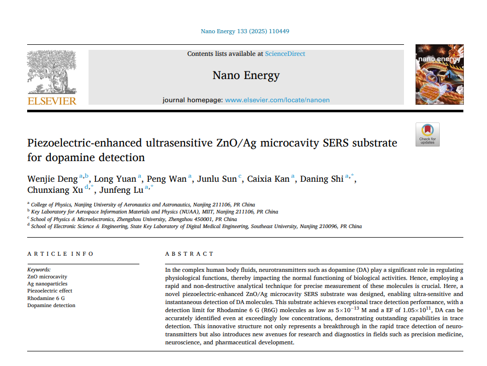 手机娱乐城官方网站 光电功能材料器件与物理研究团队卢俊峰副研究员、施大宁教授与东南大学徐春祥教授合作,基于ZnO材料特有的压电特性,构建出一种压电增强型微腔结构SERS基底。本工作利用压电场来调控基底富集物质分子的能力,并协同回音壁模式(WGM)效应和局域表面等离激元共振效应(LSPR)耦合作用,实现了多巴胺分子的超灵敏探测,显示出优异的痕量检测性能。相关成果以“Piezoelectric-enhanced ultrasensitive ZnO/Ag microcavity SERS substrate for dopamine detection”为题在线发表在能源材料期刊《Nano Energy》上。博士研究生邓文洁为该工作第一作者,卢俊峰副研究员、施大宁教授、东南大学徐春祥教授为共同通讯作者。