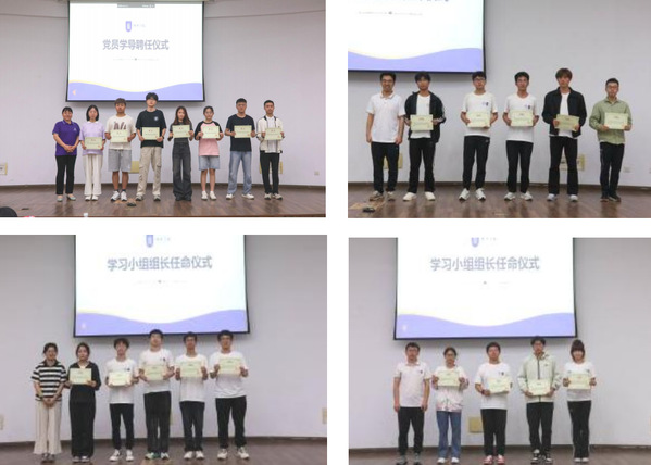 在与会人员的掌声中,院教学副院长阚彩侠为本科生学生党支部的党员学导颁发聘书,此次选拔出的党员学导共计8人。大一年级班主任胡高科、卢俊峰及启明导师代表顾晓蓉,为大一年级学习小组组长颁发任命书,共计选拔15人。