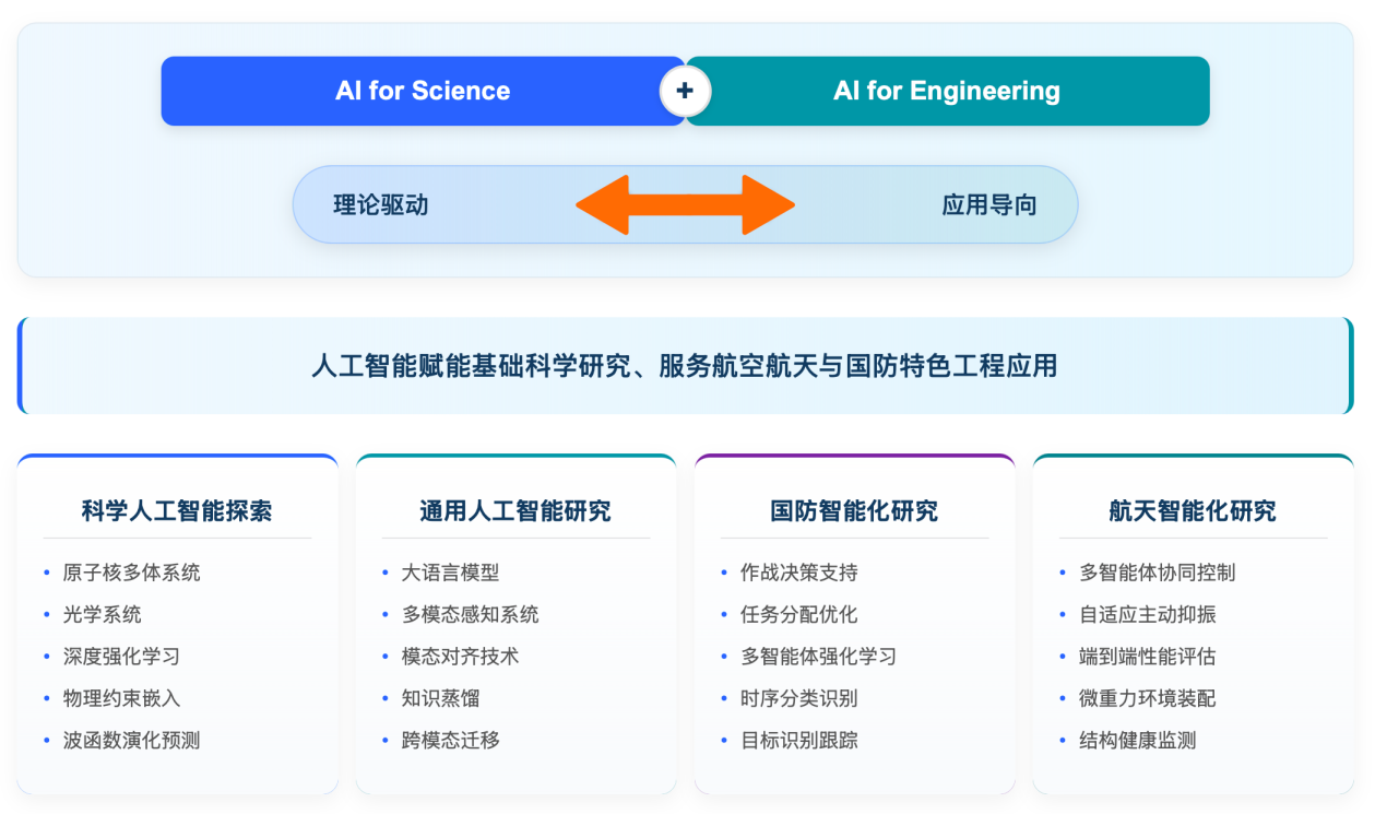 面向科技前沿发展方向和国家重大战略需求,南航科学人工智能团队将以“人工智能赋能基础科学研究、服务航空航天与国防特色工程应用”为目标,持续深化人工智能算法与物理系统建模的深度融合,构建具有自主创新能力的“AI for Science + AI for Engineering”双轮驱动科研体系(图4)。