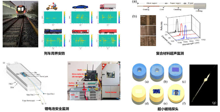 2、面向能源电力交通的特种光纤监测技术:针对锂电池安全、轨道交通、电力乃至通信等工业应用场景强电压、高温、高时空分辨等应用场景需求,基于飞秒激光直写技术实现温度、应变、声波、电流、形变等多种类型光纤传感器与阵列化多点复用技术,发展传感器阵列信号解调设备,通过原位补偿和高密度阵列解调算法,解决了温度干扰和空间分辨等难题。