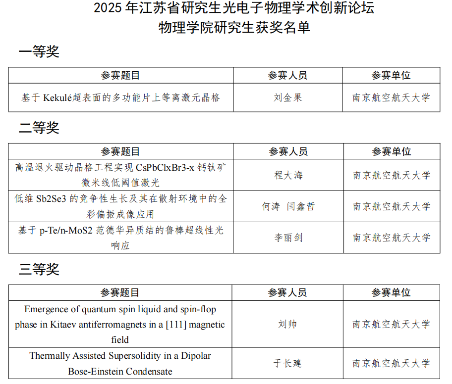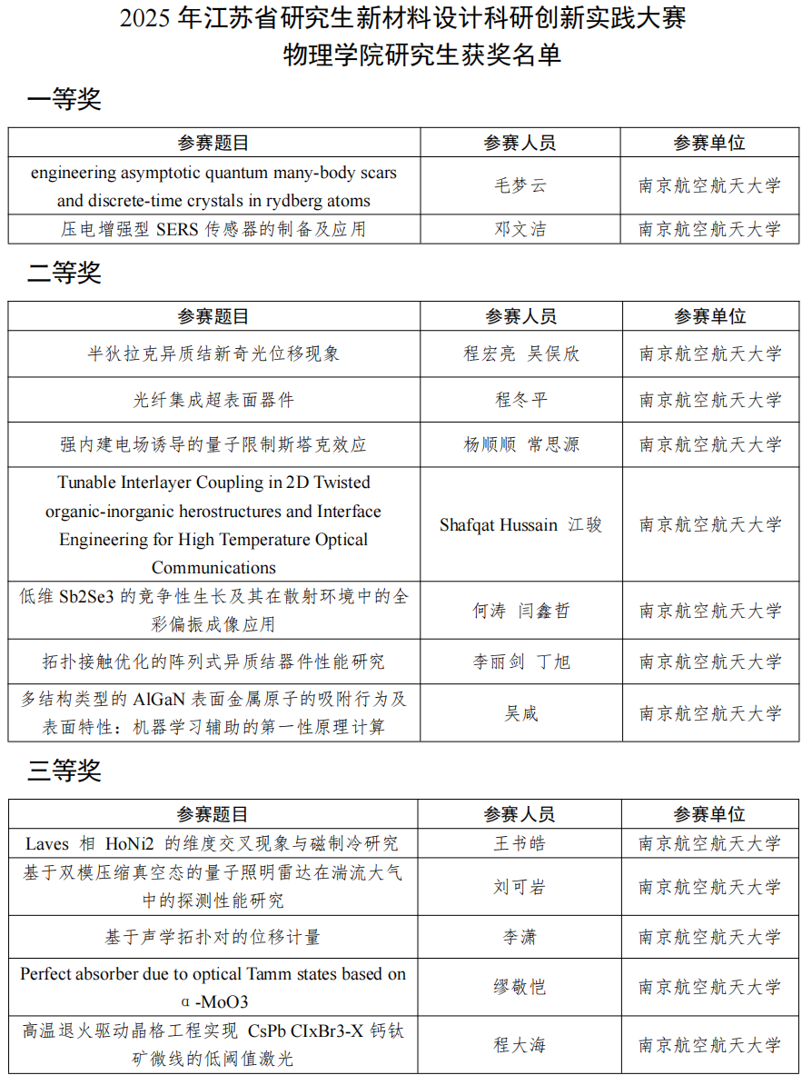 近日,2025年江苏省研究生新材料设计科研创新实践大赛、江苏省研究生光电子物理学术创新论坛分别在镇江举办。手机娱乐城官方网站 研究生积极参赛,共荣获一等奖3项、二等奖10项、三等奖7项。